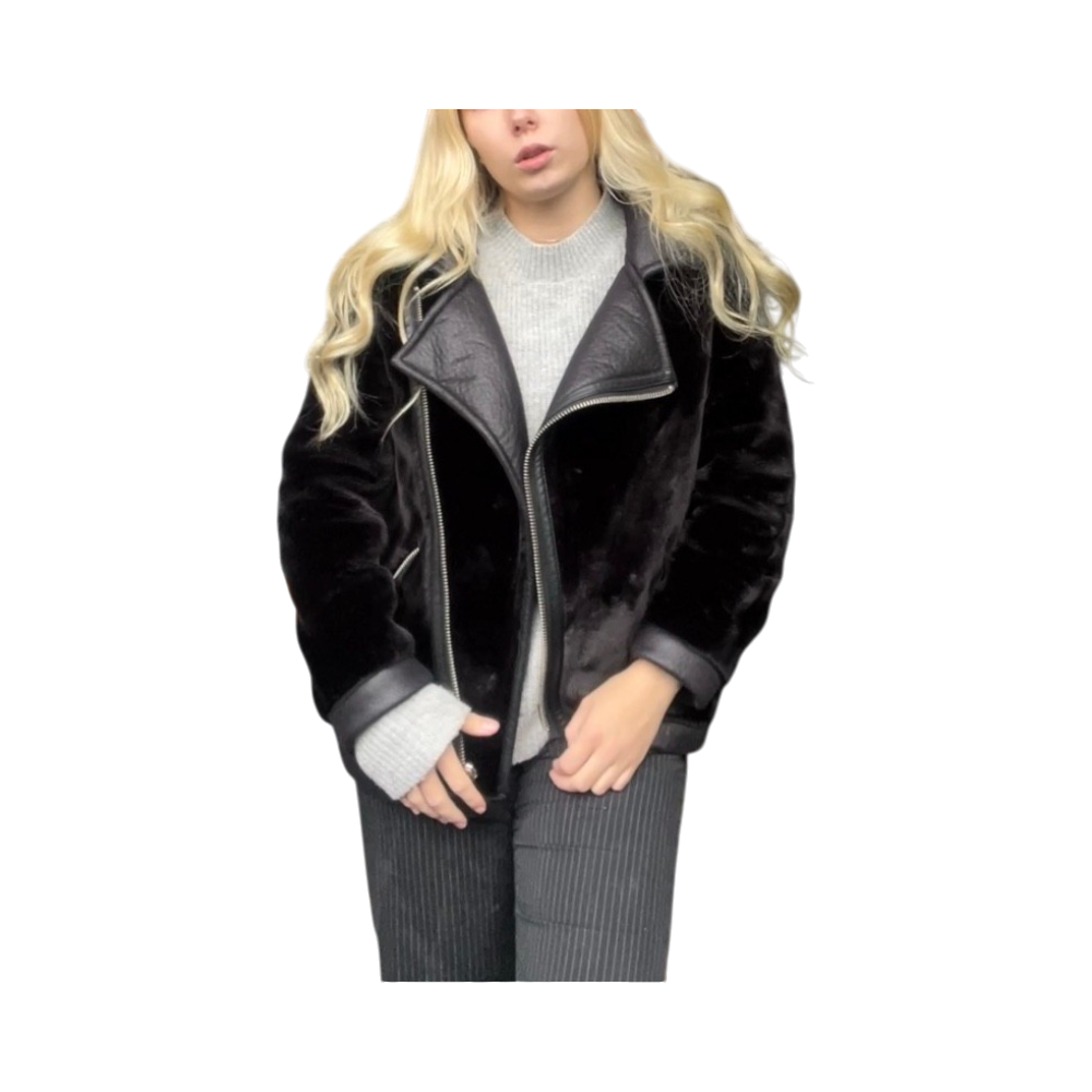 Lyhyt musta tekoturkistakki vetoketjulla.