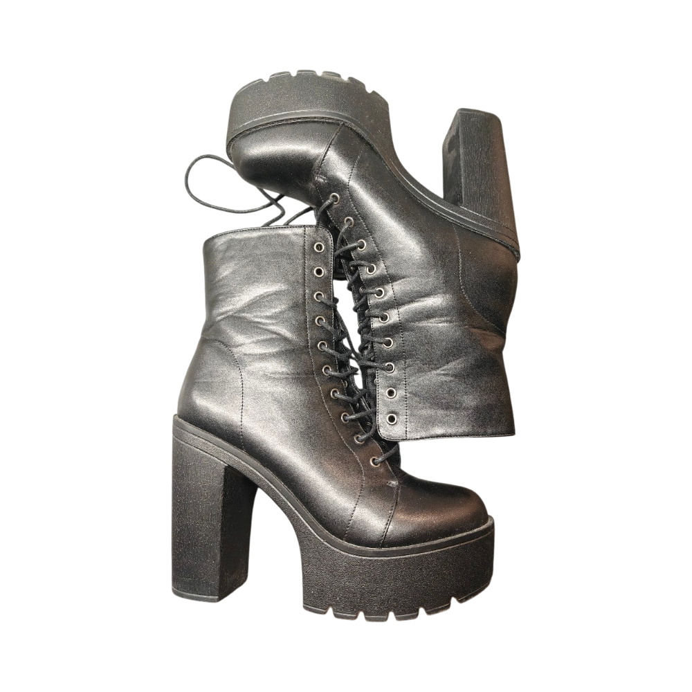 Chunky high-heel platform ankle boots with lace-up front.