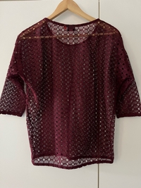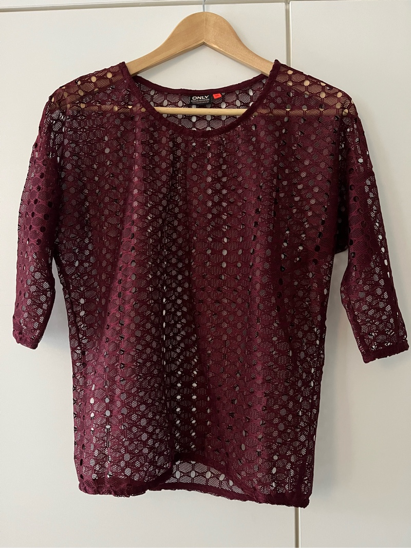 Viininpunainen/tummanvioletti verkkopaita puolipitkillä hihoilla koossa XS, menee myös S kokoiselle. Kuin uusi