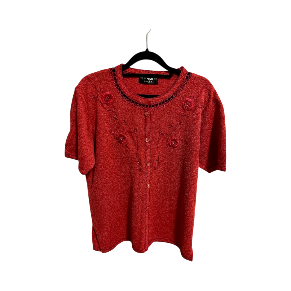 Hienostunut kukkaommel, koristenapit edessä, lyhythihainen. Koko arviolta M/L, kokolappu puuttuu.