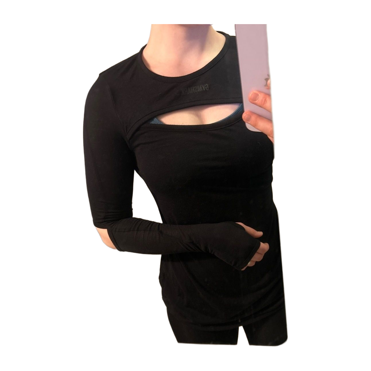 Pehmoinen erikoisempi pusero gymsharkilta, aukot rinnassa ja kyynerpäissä. Hihoissa myös aukot peukaloille. Jo postista tullessa oikeassa olkapäässä ollut pieni aukko, tämä paikattu itse