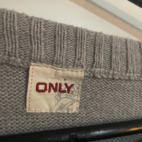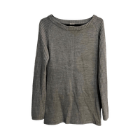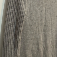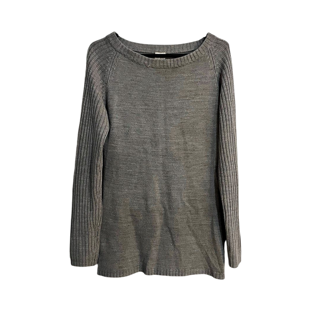 Pitkä harmaa neule, raidalliset hihat, pyöreä pääntie.