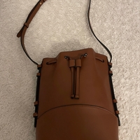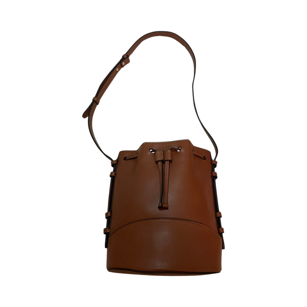 Käyttämätön ruskea Mango bucket-laukku, tyylikäs konjakin sävyinen keinonahkainen olkalaukku, jossa on säädettävä olkahihna ja nyörikiristys; mitat näkyvät kuvissa. Ihana laukku, itsellä ei ole tullut vain käyttöä.