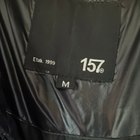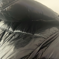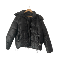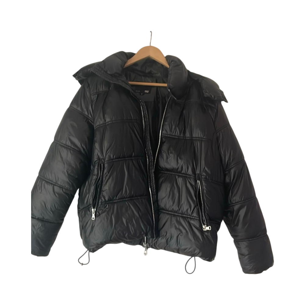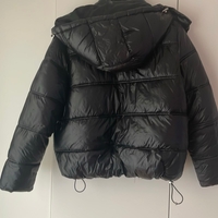 Lyhyt musta toppatakki hupulla, vetoketjulliset taskut.