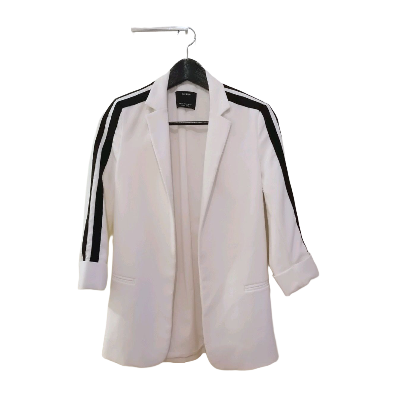 Valkoinen jakku/bleiseri. Molemmissa hihoissa yksityiskohtana mustat raidat. 3/4 -pituiset hihat. Toisessa olkapäässä (takana, ei häiritse tai suuremmin näy käytössä) pieni musta jälki, joka ei lähde pesussa, kts. kuva numero 4.