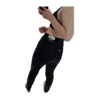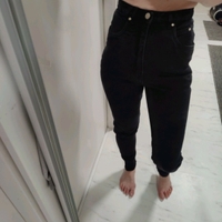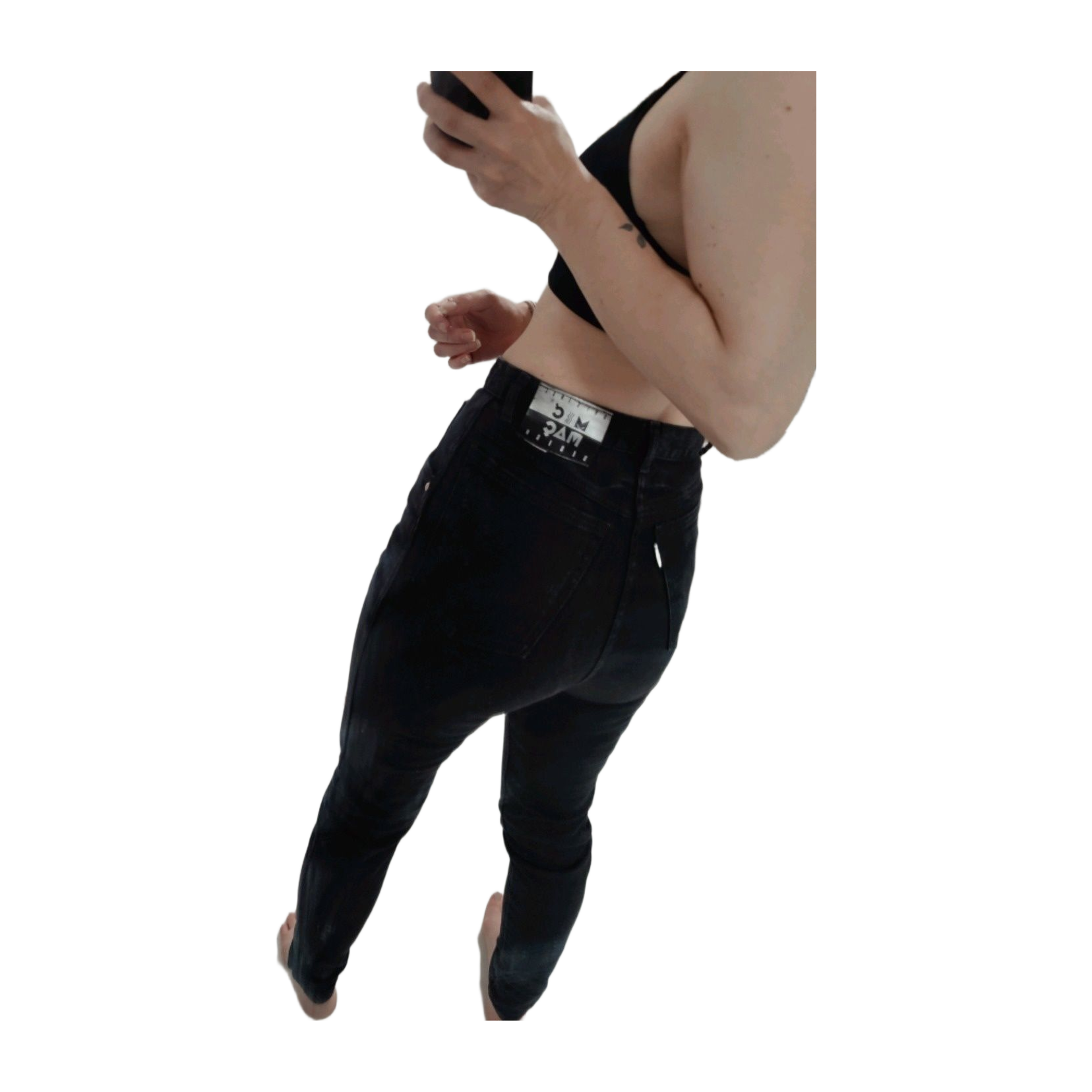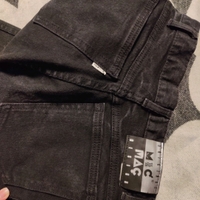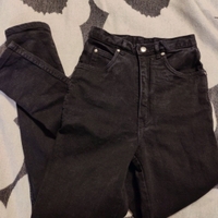 Micmacin äärettömän hyvänä pysyneet napakat superkorkeavyötäröiset farkut. Kokomerkintää ei ole, vastaa aika tasan 25"/xs. Pitkäselkäisen unelma, ylettyvät satavarmasti navan yläpuolelle ilman että kirraavat haaroista. Nykyään vain harmillisesti itselleni liian napakat ja epämukavat leikkausarven vuoksi. Paksua matskua, joustavat just sopivasti. Väri kulutettu musta.