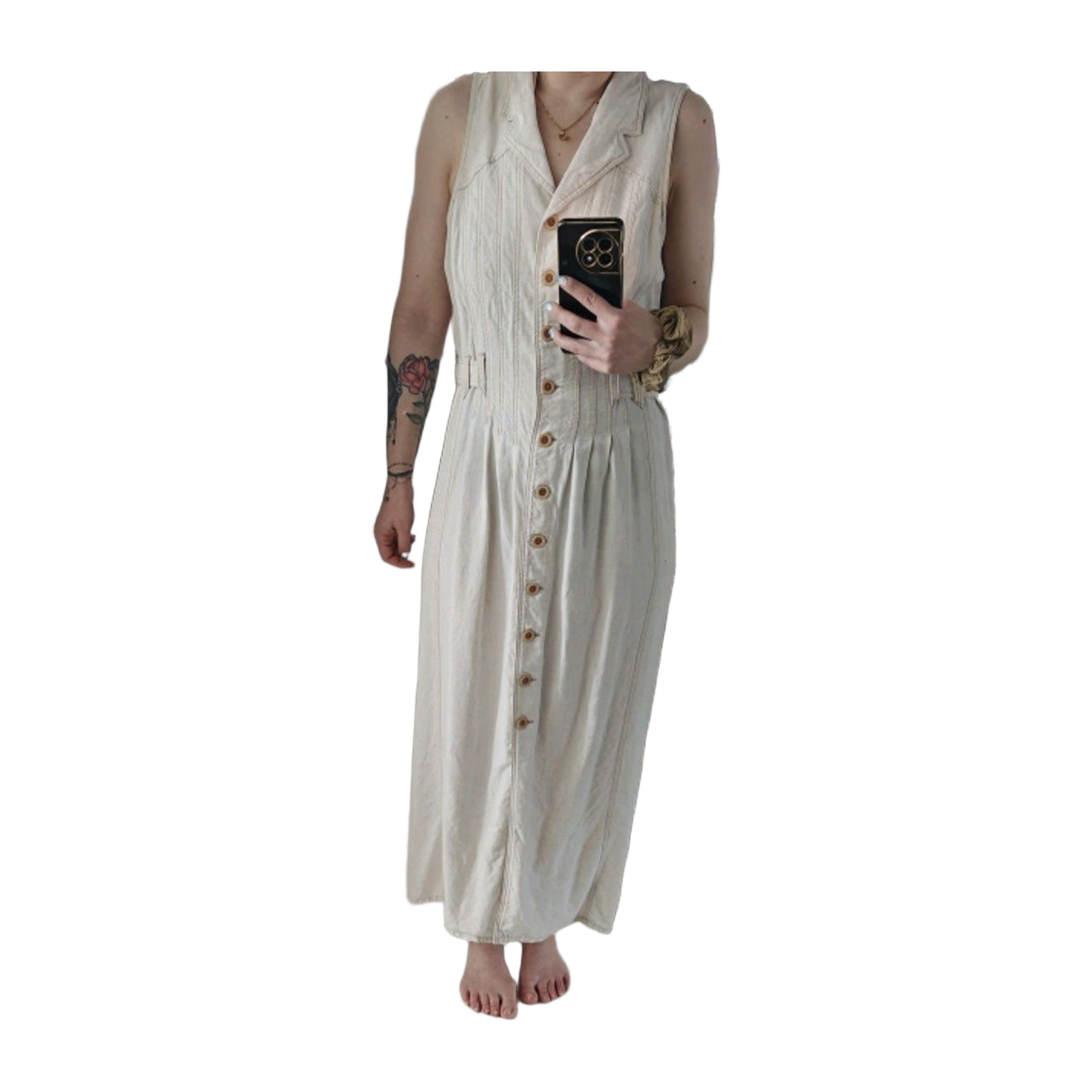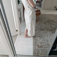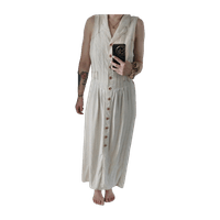 Voglian kaunis mekko kokoa 36, 80% tencel, 20% pellava. Todella hyväkuntoinen. Kiva myös xs-kokoiselle kun napeilla saa säädettyä vyötäröä. Takana helmassa halkio.
