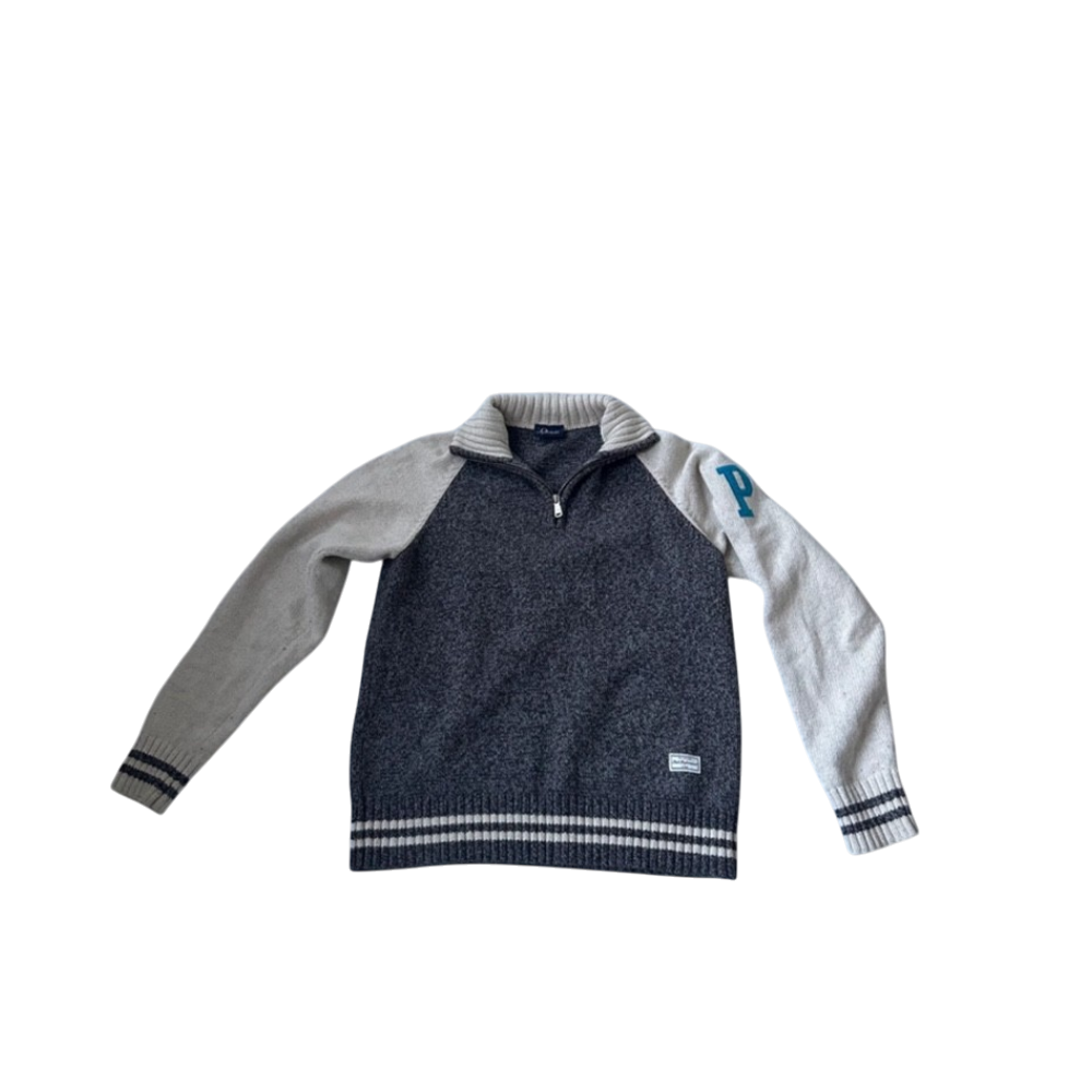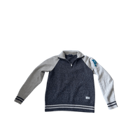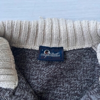 Harmaa/kerma puolivetoketjullinen villasekoiteneule.