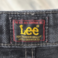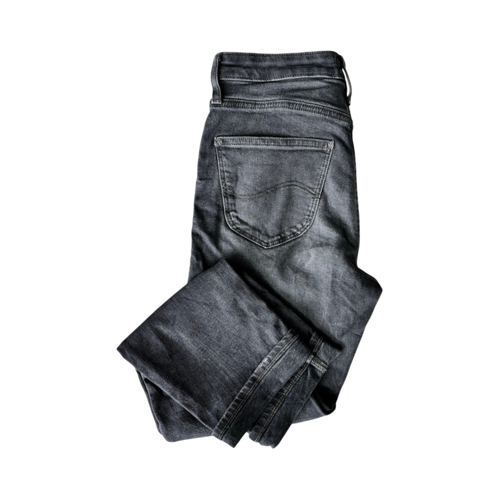 Naisten mustaharmaat Lee-farkut, istuu hyvin päälle, suorat lahkeet.