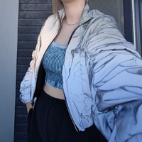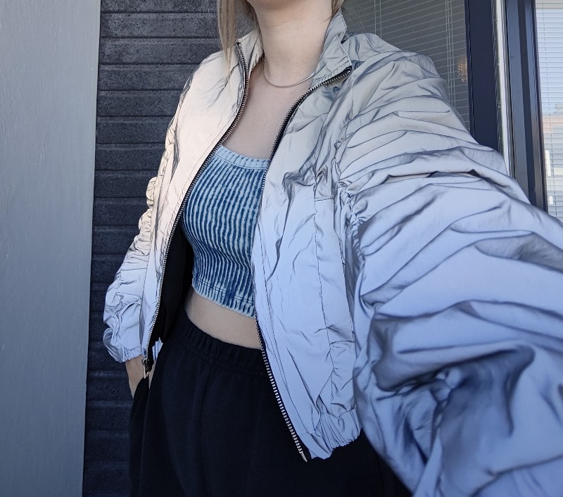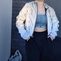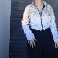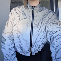 Heijastavasta kankaasta valmistettu New Yorkerin FB sister-brändin crop-mallinen kevyt ulkoilutakki taskuilla. Kokomerkintä M, mutta istuu paremmin XS/34-S/36. S-kokoiselle aika istuva, XS-kokoiselle hieman väljempi. Materiaalit ei tiedossa, laput leikattu irti, mutta arviolta polyesteriä. Hyväkuntoinen, ainoastaan hyvin pieni jälki edessä, joka näkyy vikassa kuvassa. 🩶