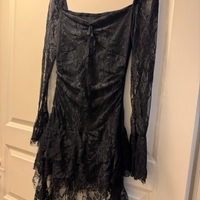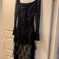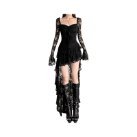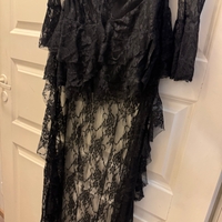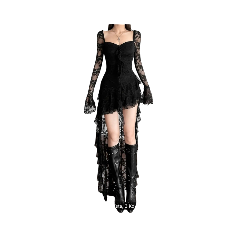 Pitkäntaitteinen, röyhelöinen musta pitsimekko. korealainen vaateita tyylikäs girl gruop käyttää Le sserafim