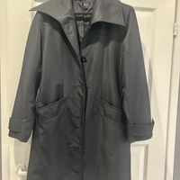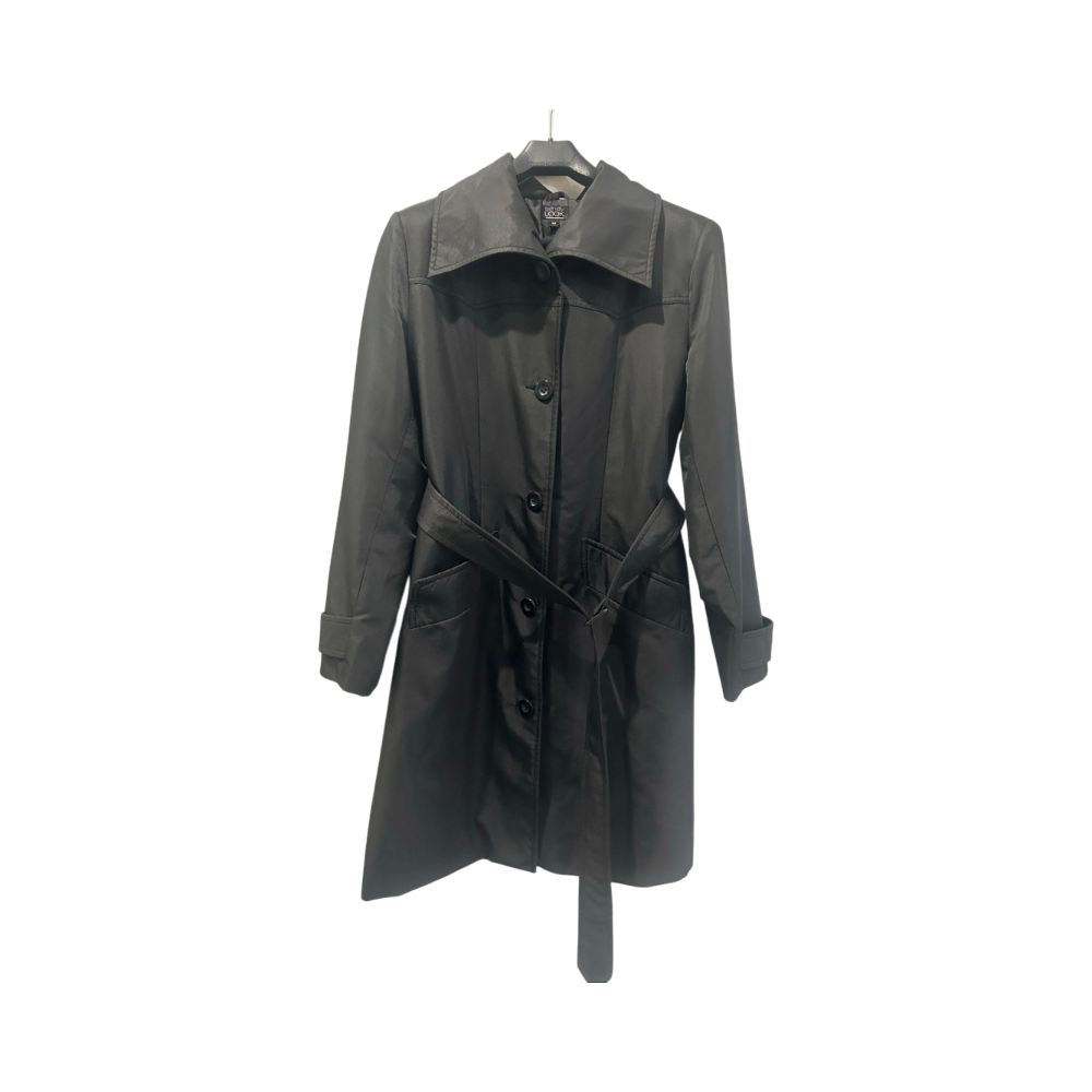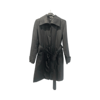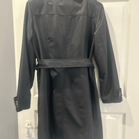 Musta trenssitakki, vyöllä, siisti käytetty kunto