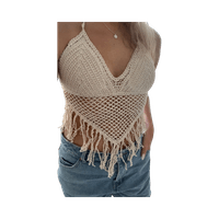 Virkattu toppi. Selkäosa avonainen. Kiinnitys solmimalla naru takaata.