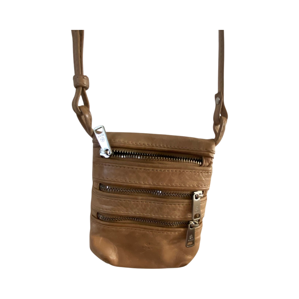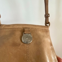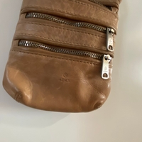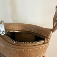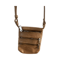 Pieni olkalaukku, useita vetoketjutaskuja, säätöremmi.