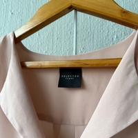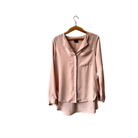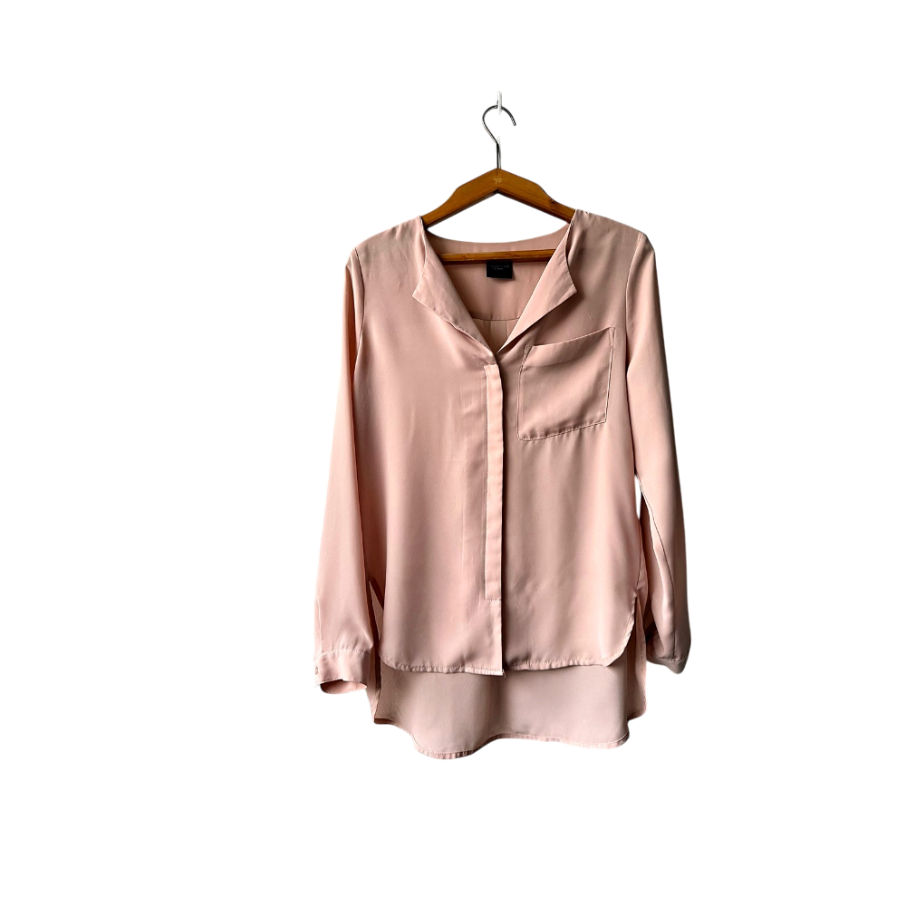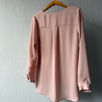 Vaaleanpunainen pitkähihainen pusero. Koko 36, kainalo-kainalo 56 cm ja pituus 79 cm. Väljä malli. Yleiskunto hyvä, mutta pari pientä langanvetoa.