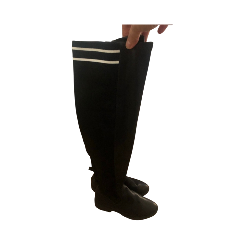 Nilkkapituiset mustat stretch-saappaat valkoisilla raitadetaljeilla.