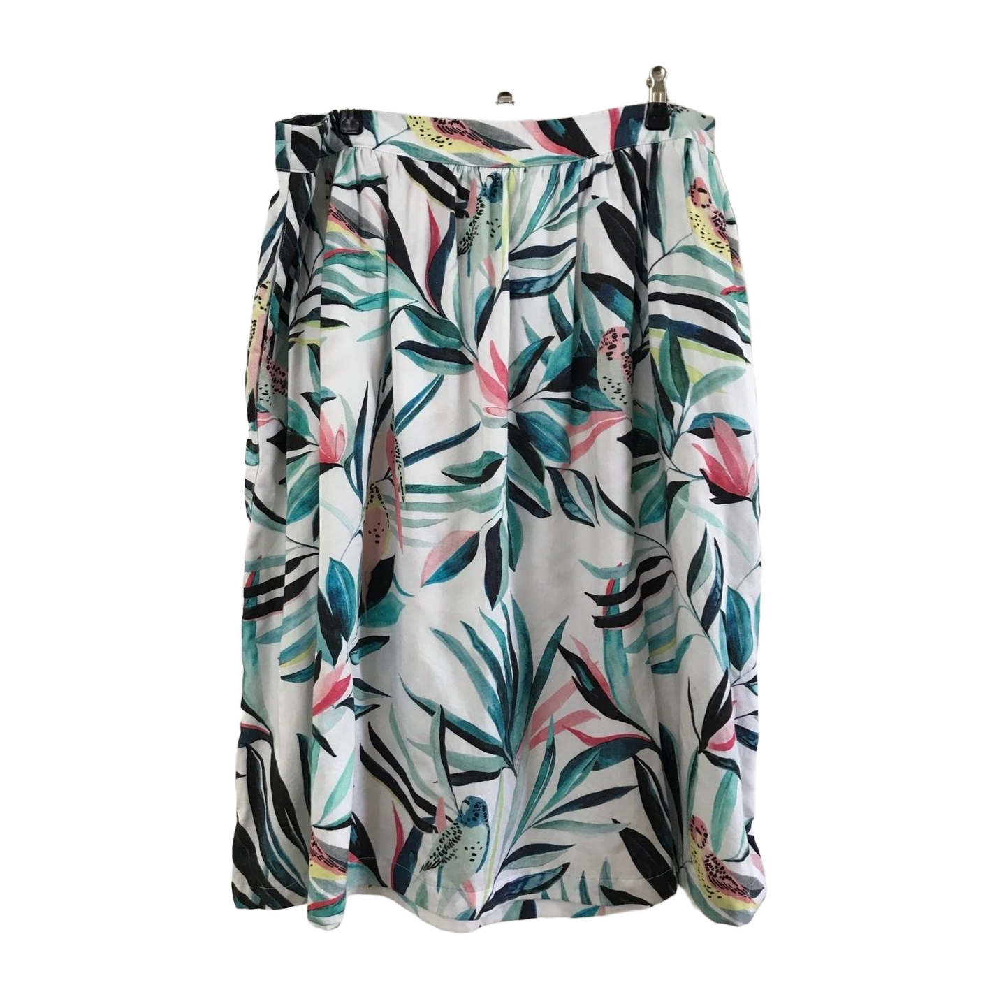 Hame Armedangels. Valkoisella pohjalla värikäs trooppinen kuvio, jossa mm turkoosia ja pinkkiä. Erillinen vyö samaa kangasta. Erinomainen kunto.