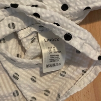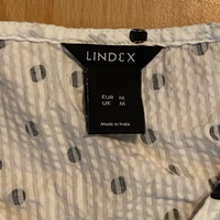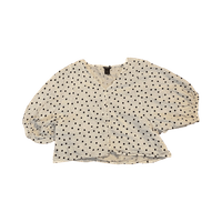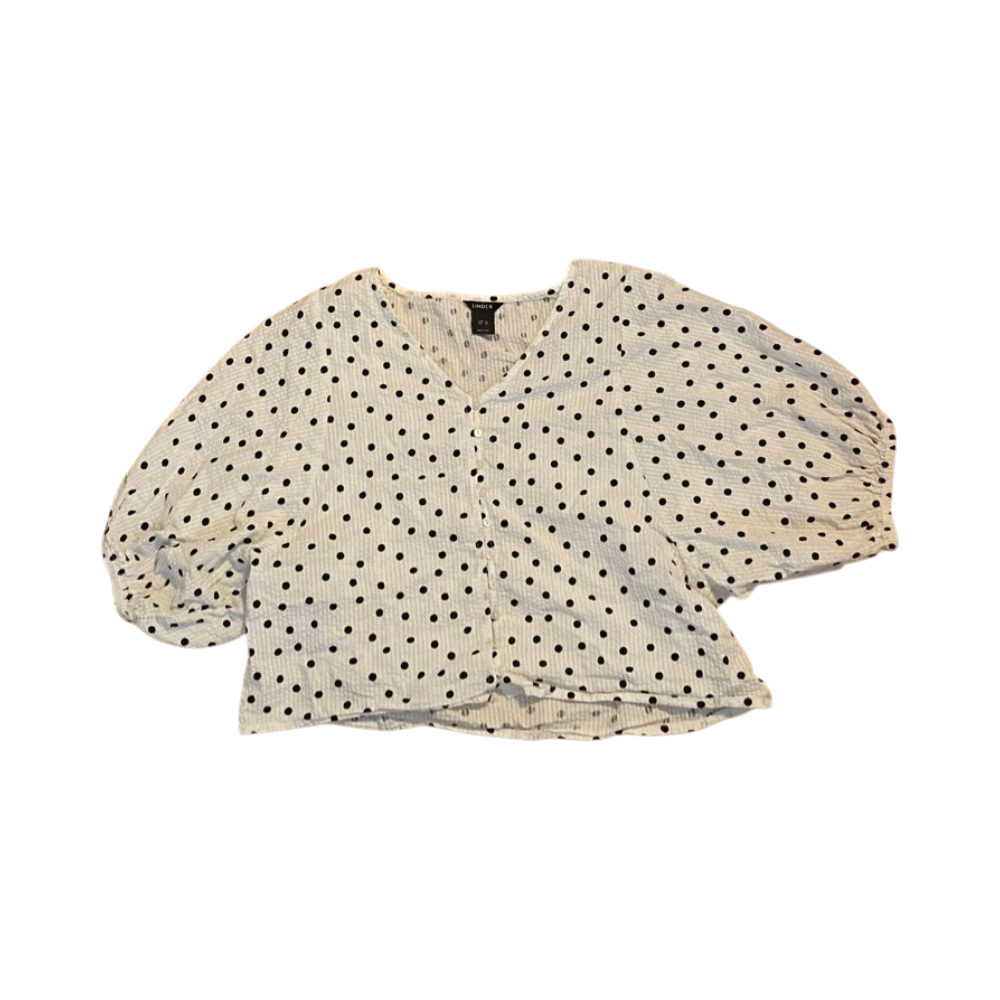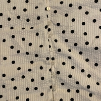 Valkoinen mustapilkullinen lyhyt pusero, väljät hihat.