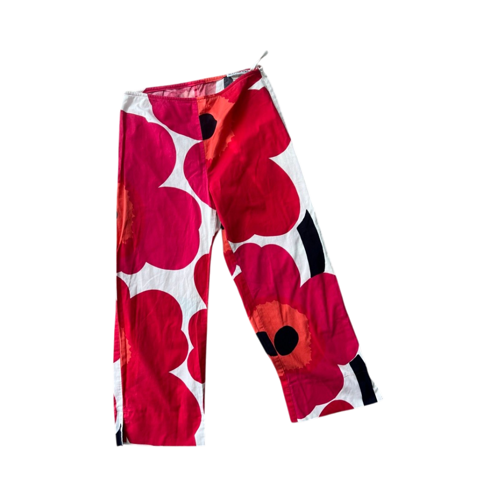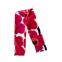Marimekon Unikko housut, hyvässä kunnossa. Koko 36, lahkeen sisämitta 64cm ja vyötärönympärys noin 70cm. Suorat lahkeet
