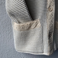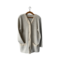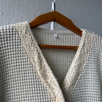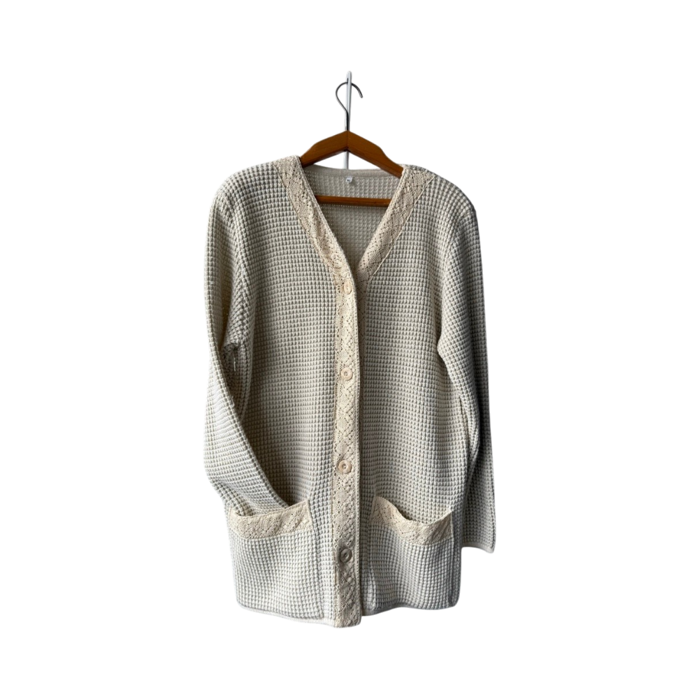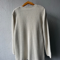 Beige paksu neuletakki. Koko XL, kainalo-kainalo 53 cm ja pituus 81 cm. Materiaali puuvillaa ja akryylia.