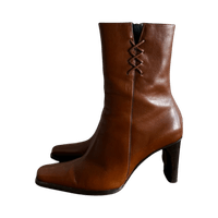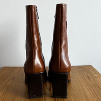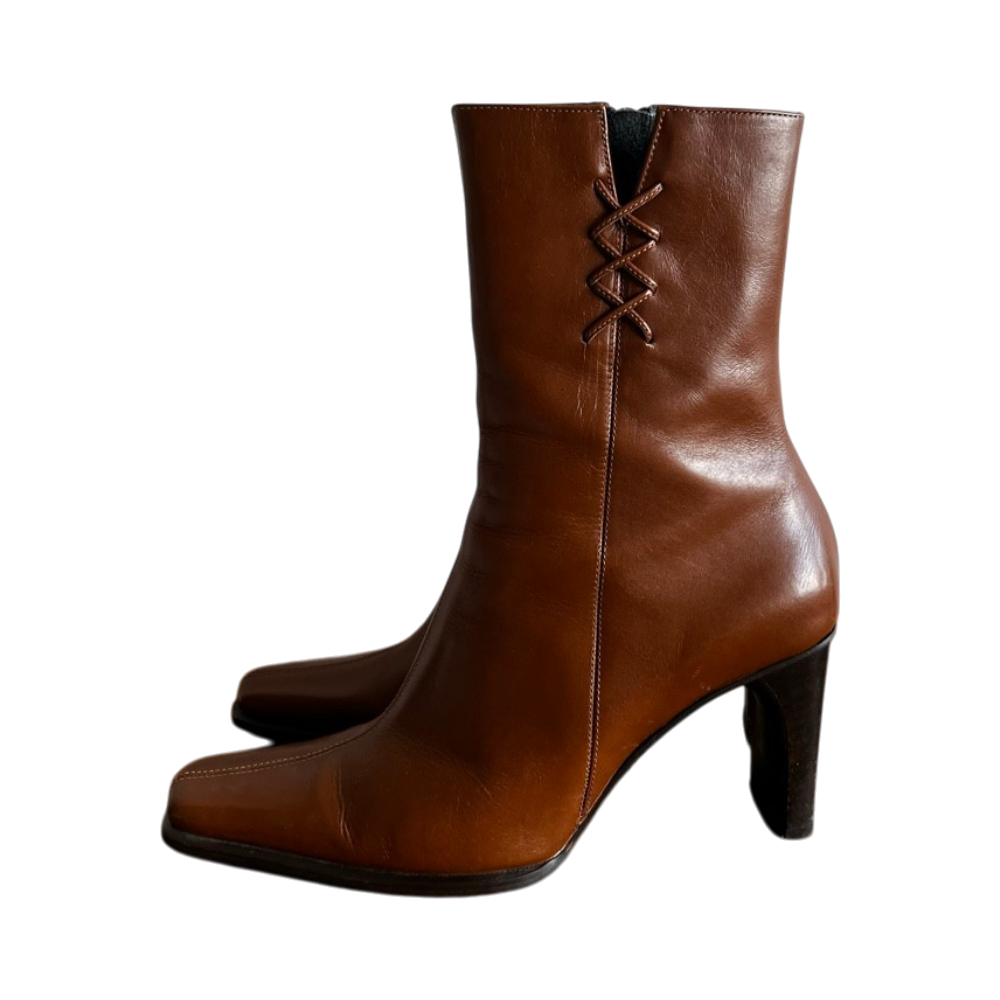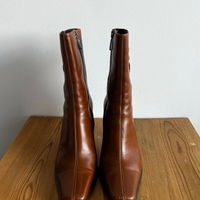Naisellisen sirot Red Shoe nahkanilkkurit, koko 37, vastaavat kokoaan. Nilkkurit ovat upeaa, kinuskinruskeaa nahkaa. Kapea, kulmikas kärki. Korkea, tukeva korko. Ulkopohja on uritettu. Sisäsyrjässä vetoketju. Ulkosyrjässä koristeelliset nahkanyörit. Hieman käytön jälkiä nahassa, kuitenkin oikein hyväkuntoiset. Made in Italy, ostettu Helsingistä, Fredalta Red Shoe’n omasta liikkeestä.