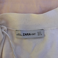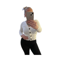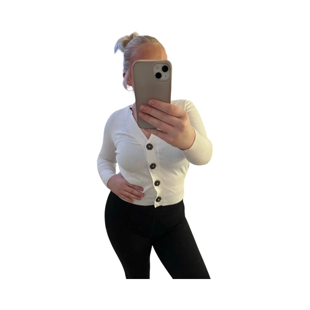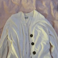 Valkea, vyötäröä myötäilevä neulejakku isoilla nappeilla.