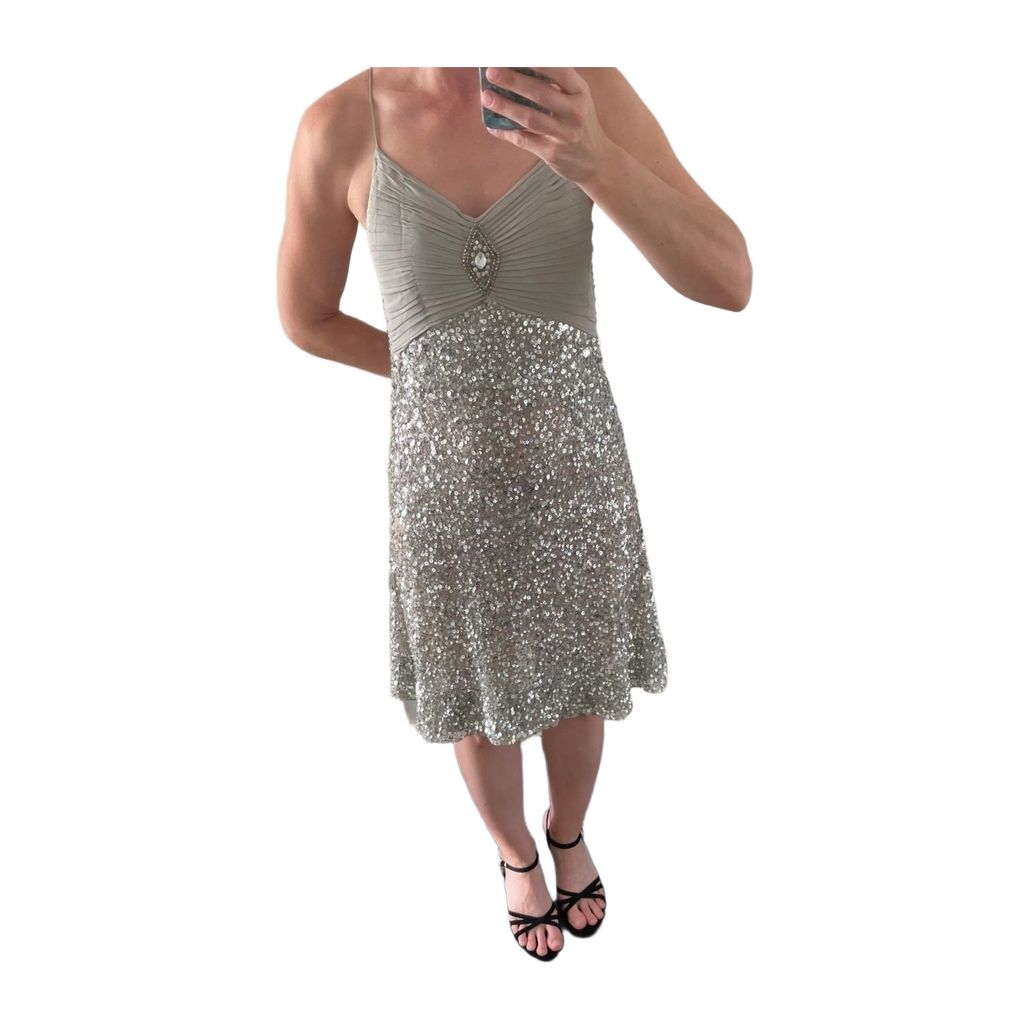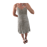 Kaunis Andiatan paljettimekko. Lyhennetty oston yhteydessä, tuotelappu samalla poistunut. On kuitenkin silkkiä, ja aito. Pieniä käytön jälkiä, eivät kuitenkaan päällä näy.
