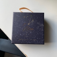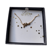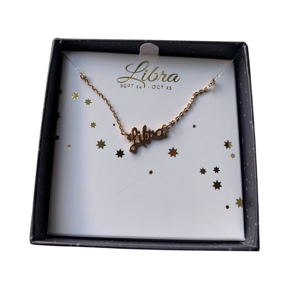 Kultainen kaulakoru, Libra-tekstiriipus, lahjapakkauksessa.