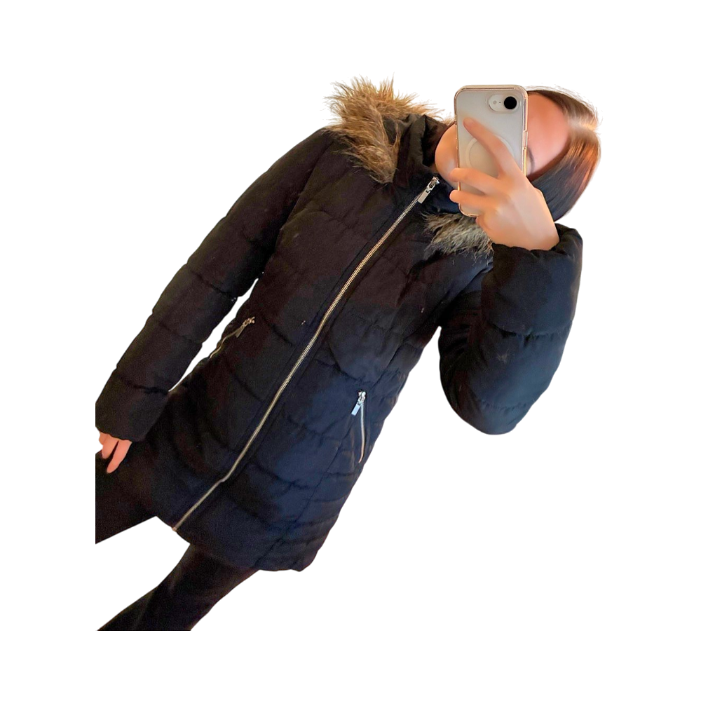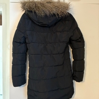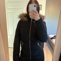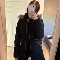 H&M musta talvitakki jossa karvahuppu, kokoa S. Tosi hyvä kunto!