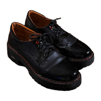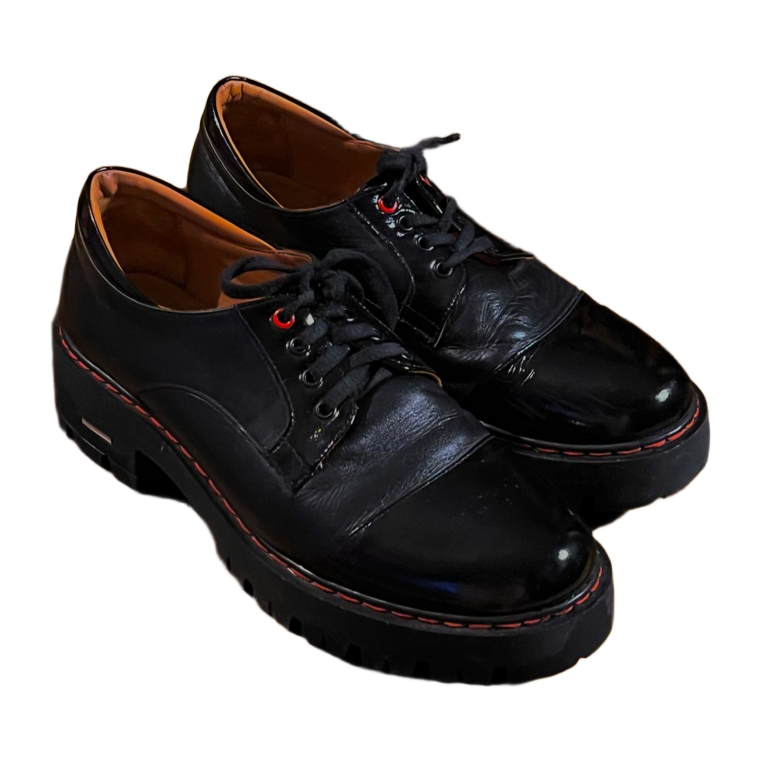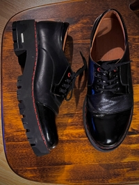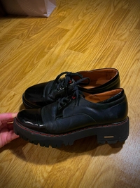 Black leather shoes in great condition. Lovely red stitching! I only used these for 2 weeks, but the leather has stretched a tiny bit as seen in the pics :). Other than that, the condition is very good.
