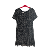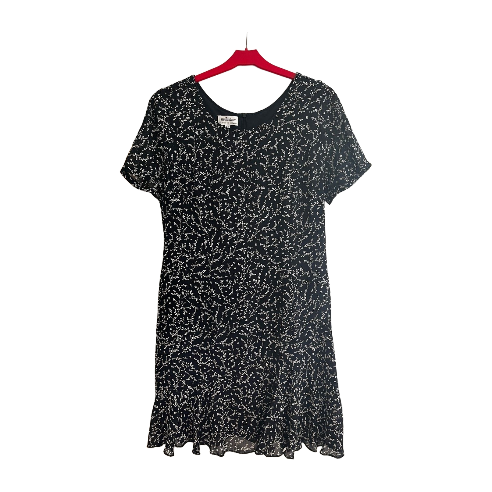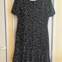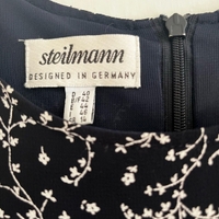 Steilmannin kesämekko, tummansinisellä pohjalla valkoista pientä kukkakuviota. Pyöreä kaula-aukko, lyhyet hihat, helmassa kauniisti laskeutuva levennys. Pituus olka-helma 97 cm, kai-kai 50 cm, vuoritettu. Ei käytetty.
