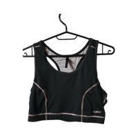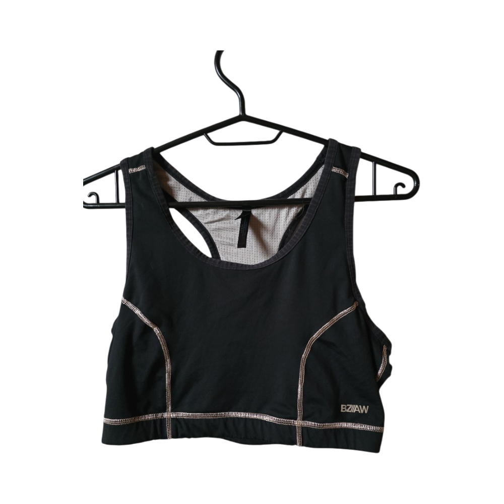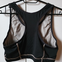Tukea tarjoava musta urheilurintaliivi, verkkovuori ja tukeva leikkaus.
