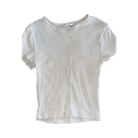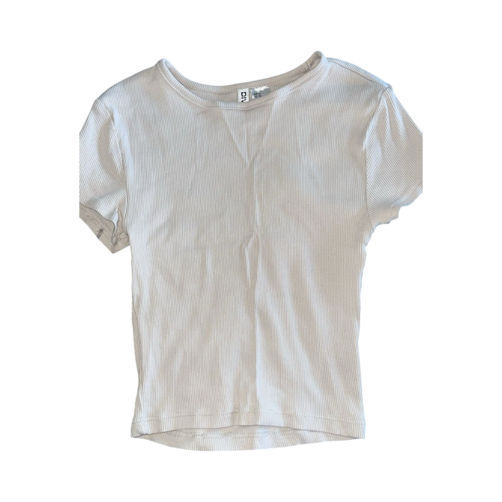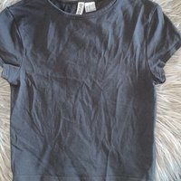 Lyhyt musta t-paita, pyöreä pääntie, lyhyet hihat.