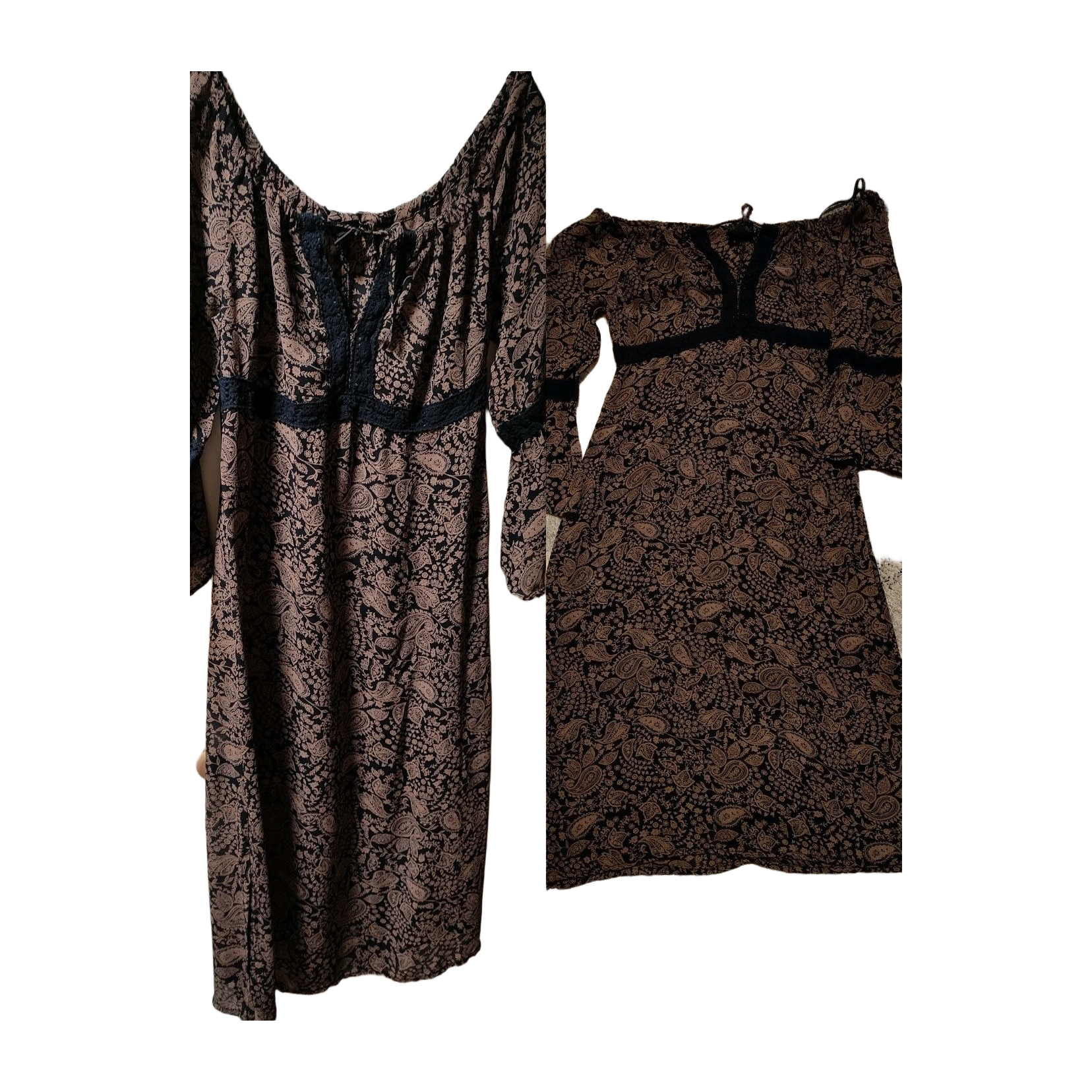Kaunis musta-ruskea paisley-kuvioinen ohut mekko. Off shoulder mallinen, mutta voinee pitää myös vähemmän avarana kiristysnyörin avulla. Aukko avautuu V- malliin. Mustat pitsitehosteet näyttävät puuvillaiselta, mutta ovat ilm. viskoosia. Hihansuut trumpetit, joissa halkio, myös molemmissa helman sivusaumoissa halkiot. Vas. kyljellä vetoketju. Koosta en tiedä, onko norm. 38 ☺️ vaikuttaa pieneltä. Todella kivan näköinen mekko, vaikkapa nahkatakin kanssa. #hm #offshoulder #mekko #paisley #38
