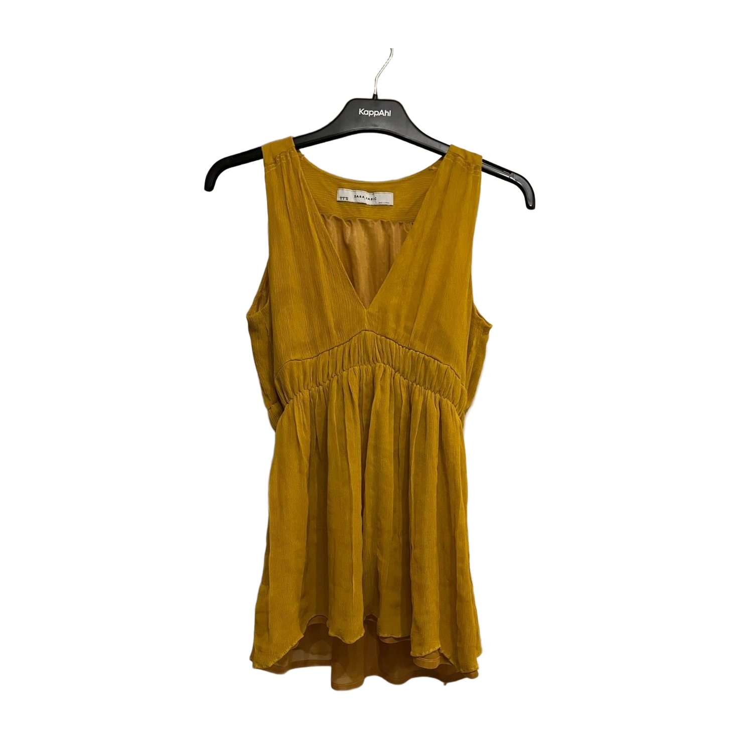 Keltainen toppi koossa s. Materiaalilappu taitaa olla poistettu mutta on 100% silkkiä. Topissa myös vuorikangas, sen materiaalista en ole varma. Rintojen alapuolella kuminauha, menee siksi myös pienelle m-koolle. Pituus 65cm.