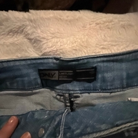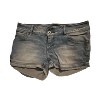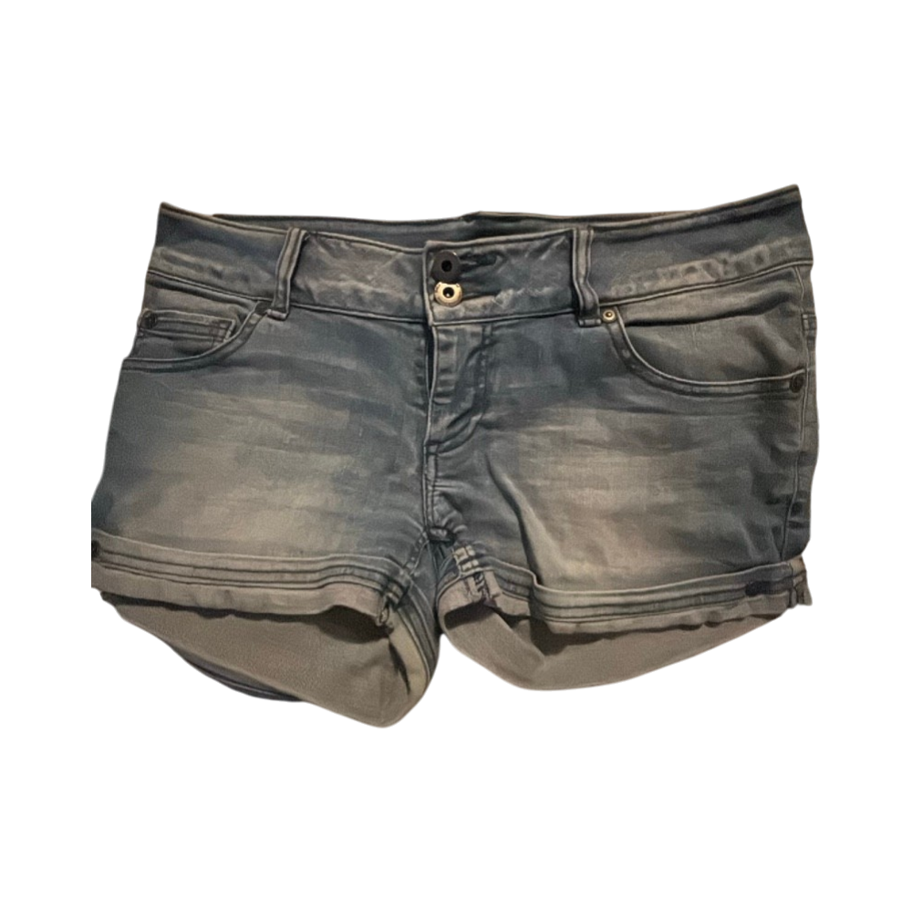 Vaaleat, kulutetut farkkushortsit, käännettävät lahkeet.