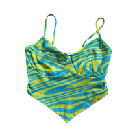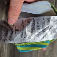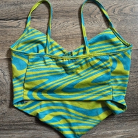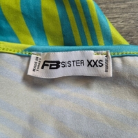 Turkoosi-keltainen toppi, koko XXS. Vastaa mielestäni enemmän kokoa XS, joustaa vähän. Ei käytetty ikinä. Polyesteria 95% ja elastaania 5%