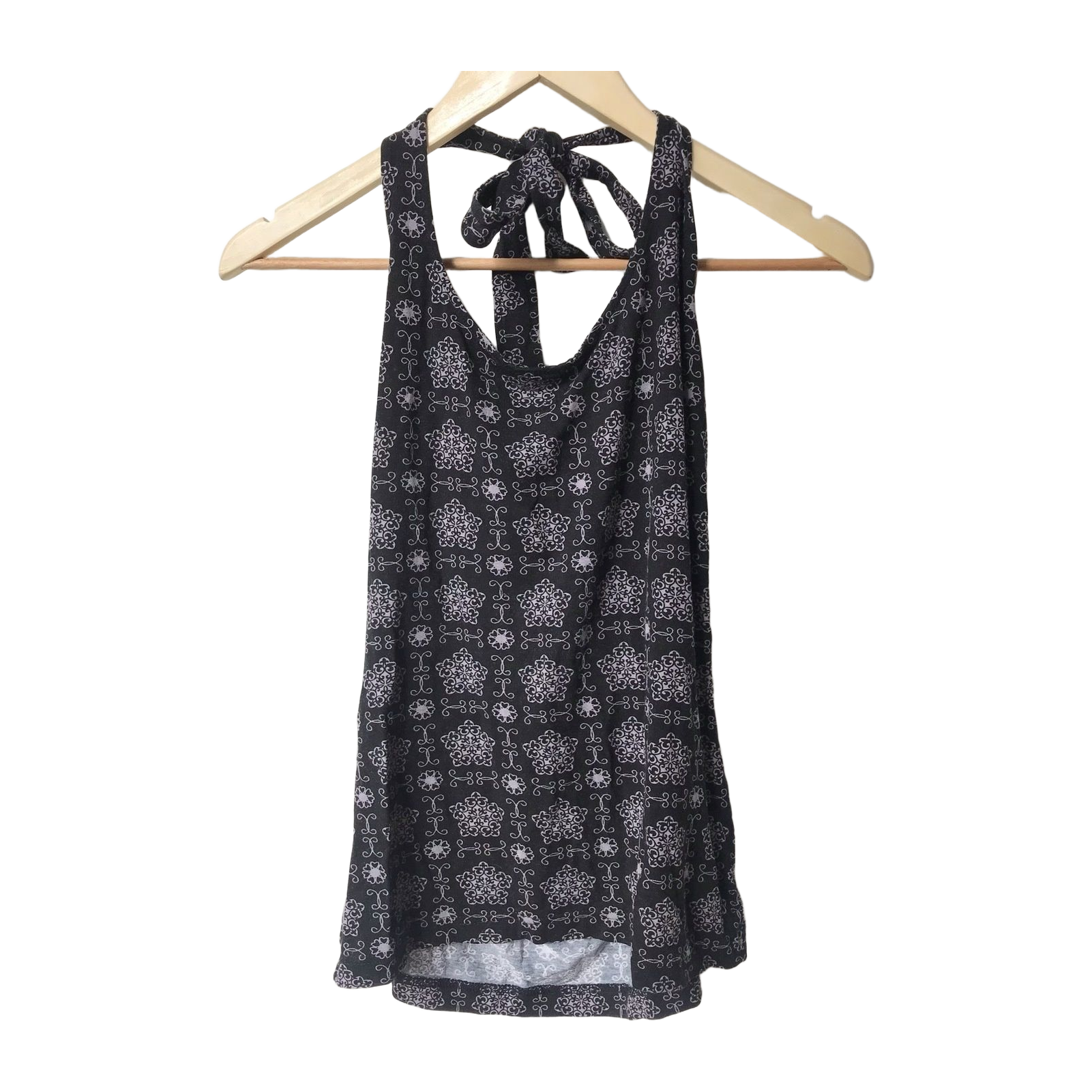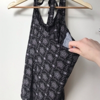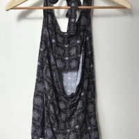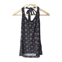 Musta toppi harmaanliilan värisillä kuvioilla. Toppi sidotaan kiinni niskasta, jolloin yläselkä jää avonaiseksi. Paidassa koko L. Merkitsin kuitenkin kooksi M, koska paita itselleni aavistuksen liian iso, ja olen kokoa S.