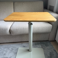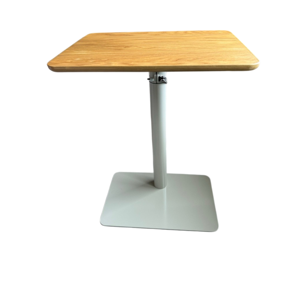 Selka-merkkinen (Sopiva S), kompakti ja manuaalisesti korkeussäädettävä työpöytä. Helppo siirtää ja toimii hyvin sekä työpöytänä että kodin apupöytänä. Kansi on massiivitammea (kerran hiottu ja öljytty Osmo TopOil, High Solid, väritön). Jalusta on jauhemaalattua metallia. Pöydän jalustan väri on vihertävän harmaa ja sen säätöväli 70-110cm eli korkeimmillaan sen korkeus on 112cm ja matalimmillaan 72cm.