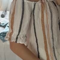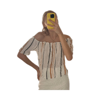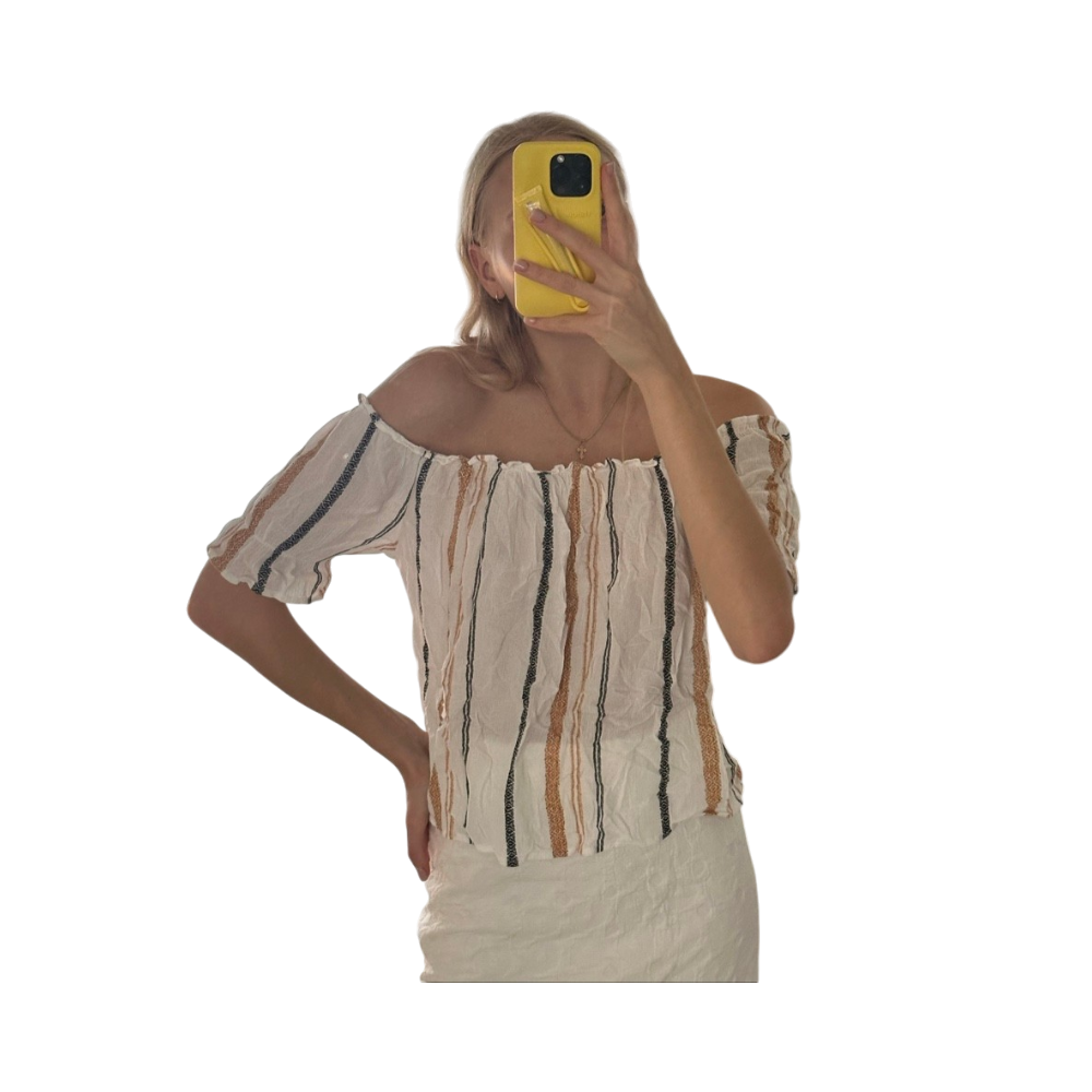 Lightweight off-shoulder top with vertical beige and navy stripes.