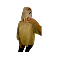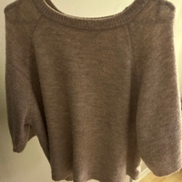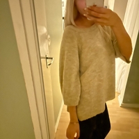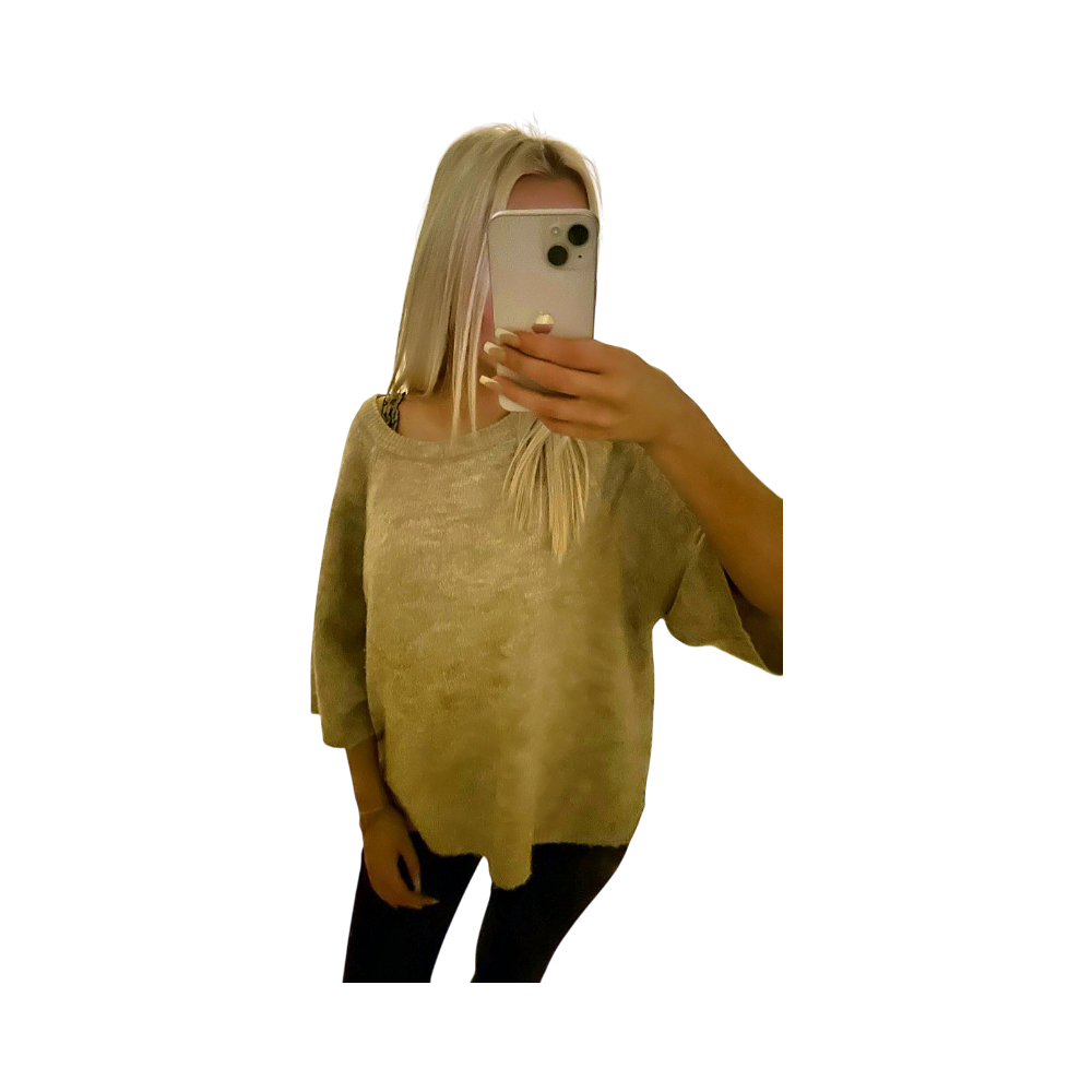 Pehmeä, väljämallinen beige neule, lyhyet hihat.