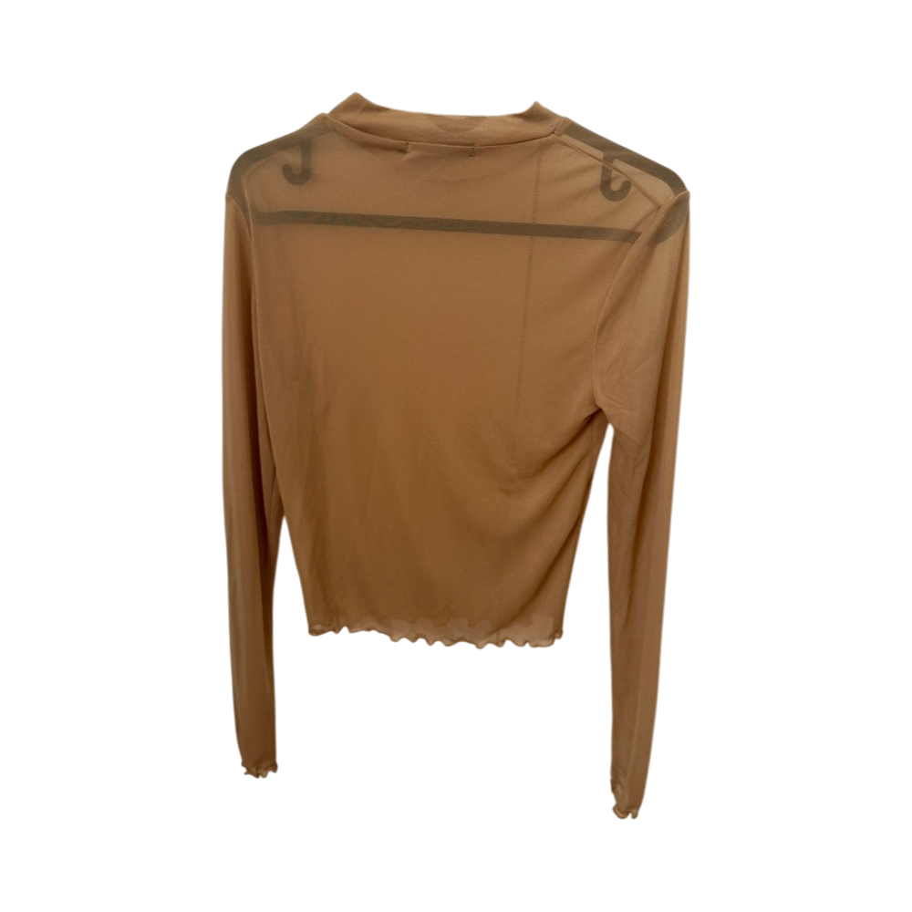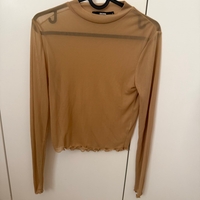Ohut beige mesh-paita, läpikuultava ja vartalonmyötäinen.