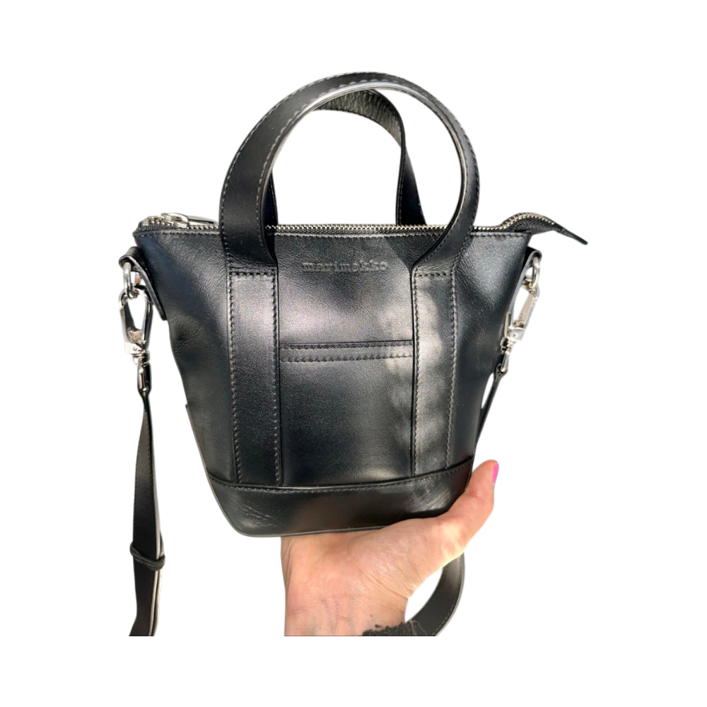 Pieni musta Marimekko-laukku, olka- ja kantokahvat, vetoketju.