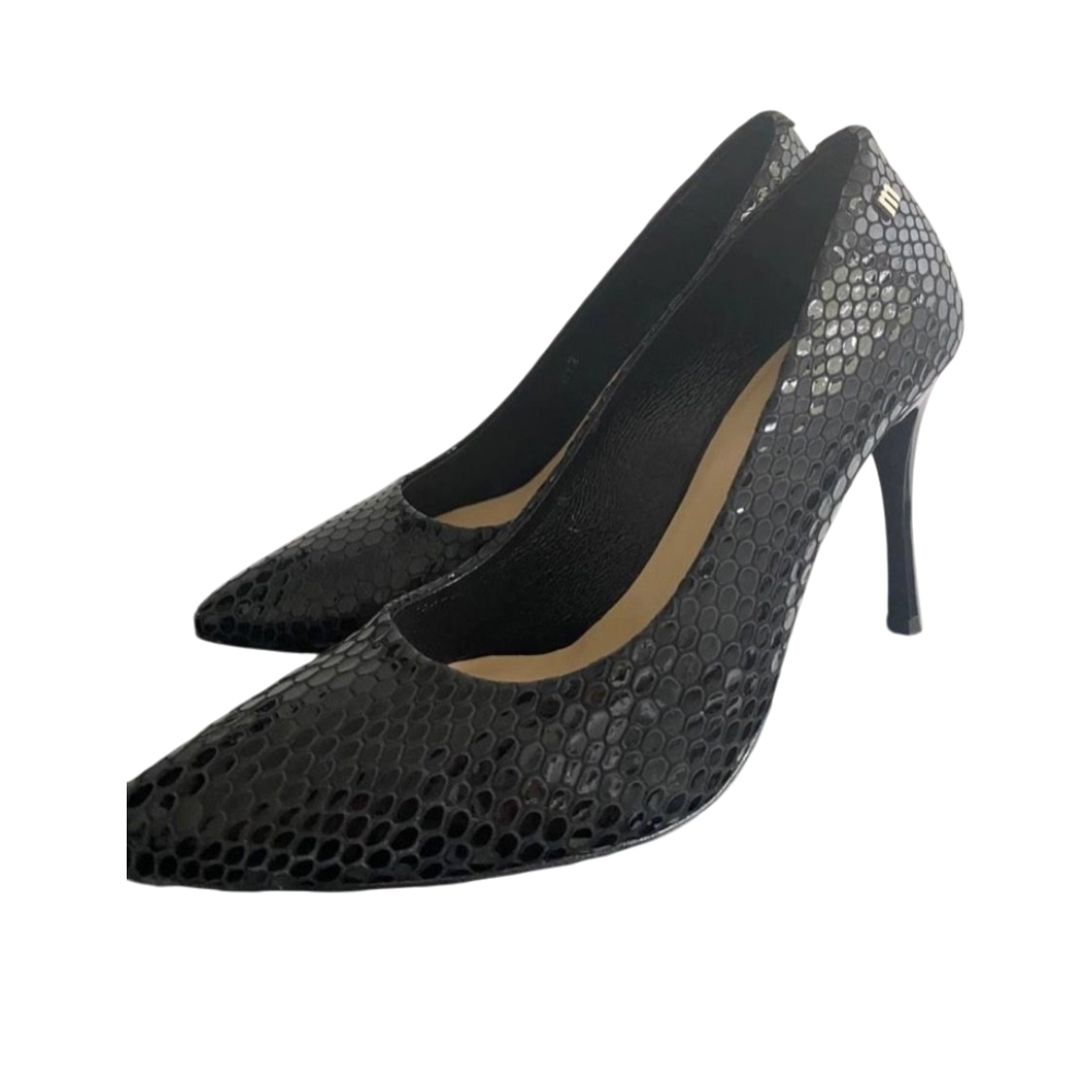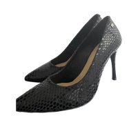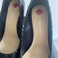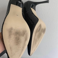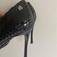 Kiiltävä pinnalla, käärmetekstuuri, korkea piikkikorko. Koko 37, vastaa kokoa. Ovh n. 90€. Kerran käytössä.