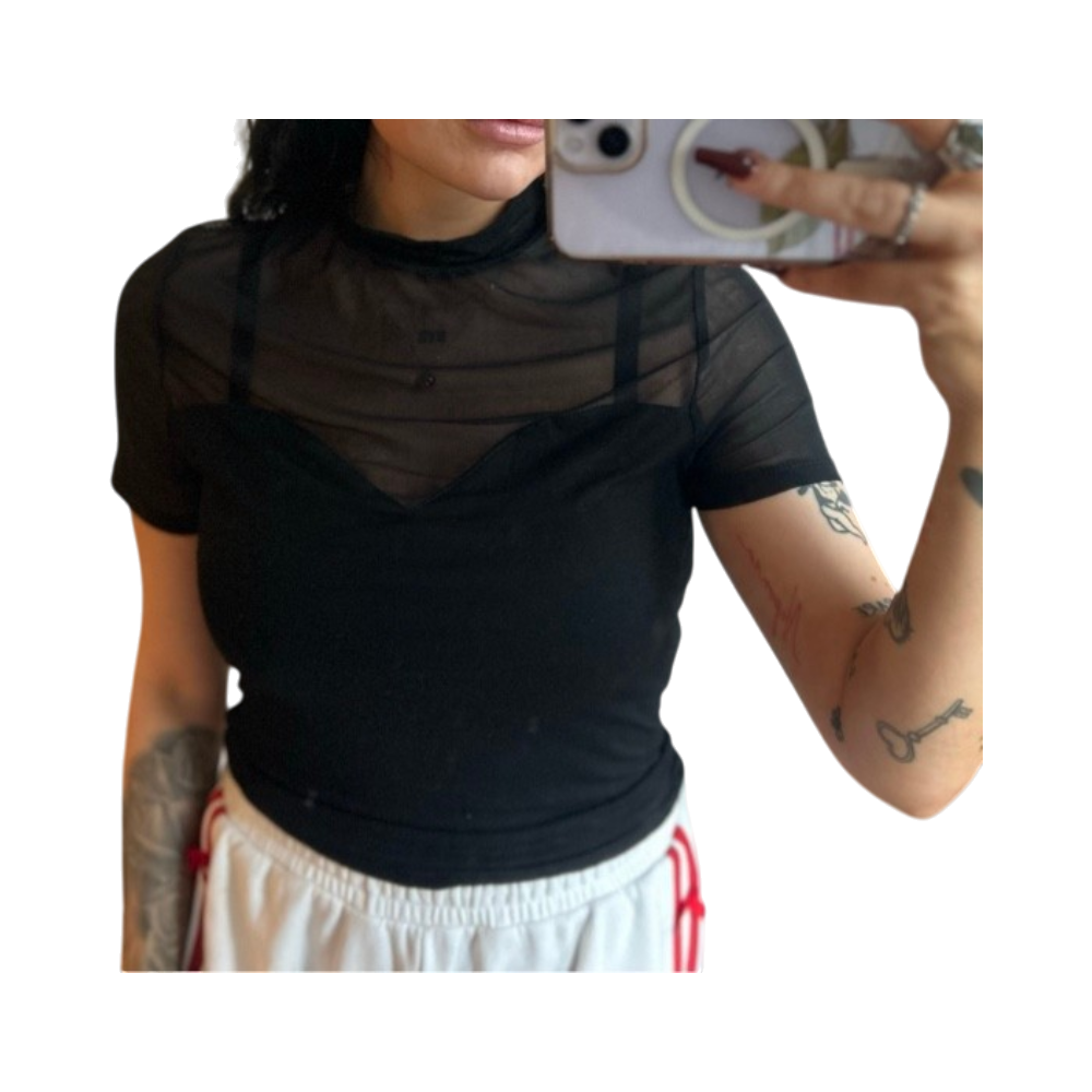 Two-layer black crop top with sheer mesh upper and short sleeves.