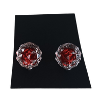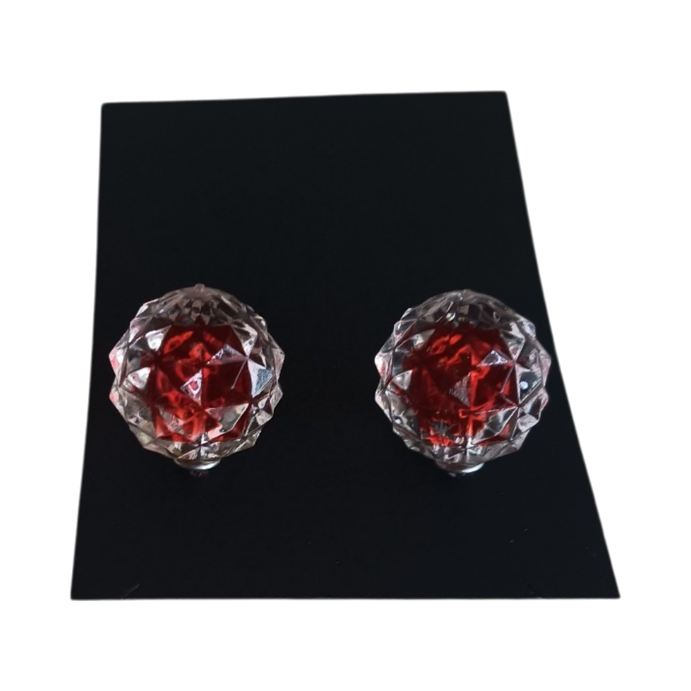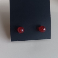 Pyöreät, punaiset nappikorvakorut. Käyttämättömät. Muovia. Tausta pieni pallo.