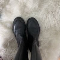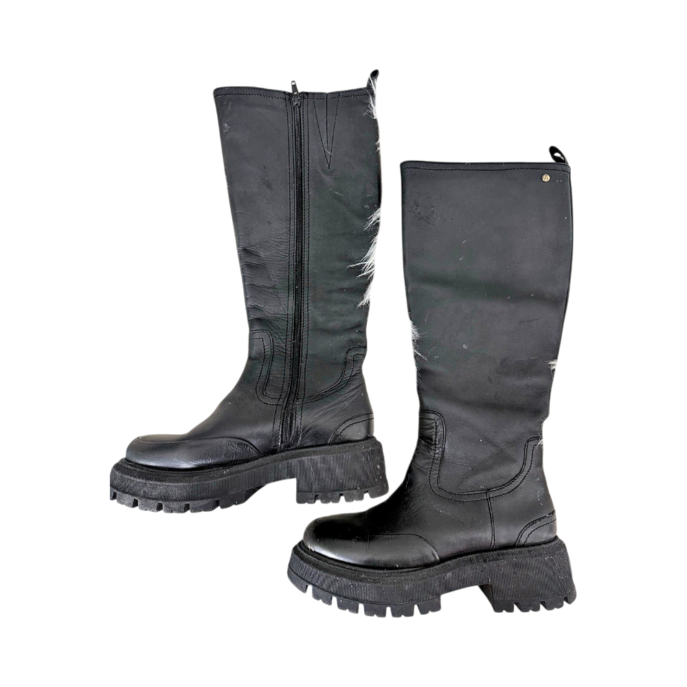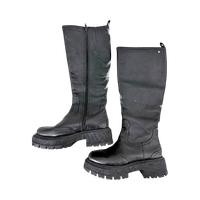 Mustat saappaat polven alapuolelle, paksumpi pohja. Sivussa vetoketju. Koko 38