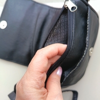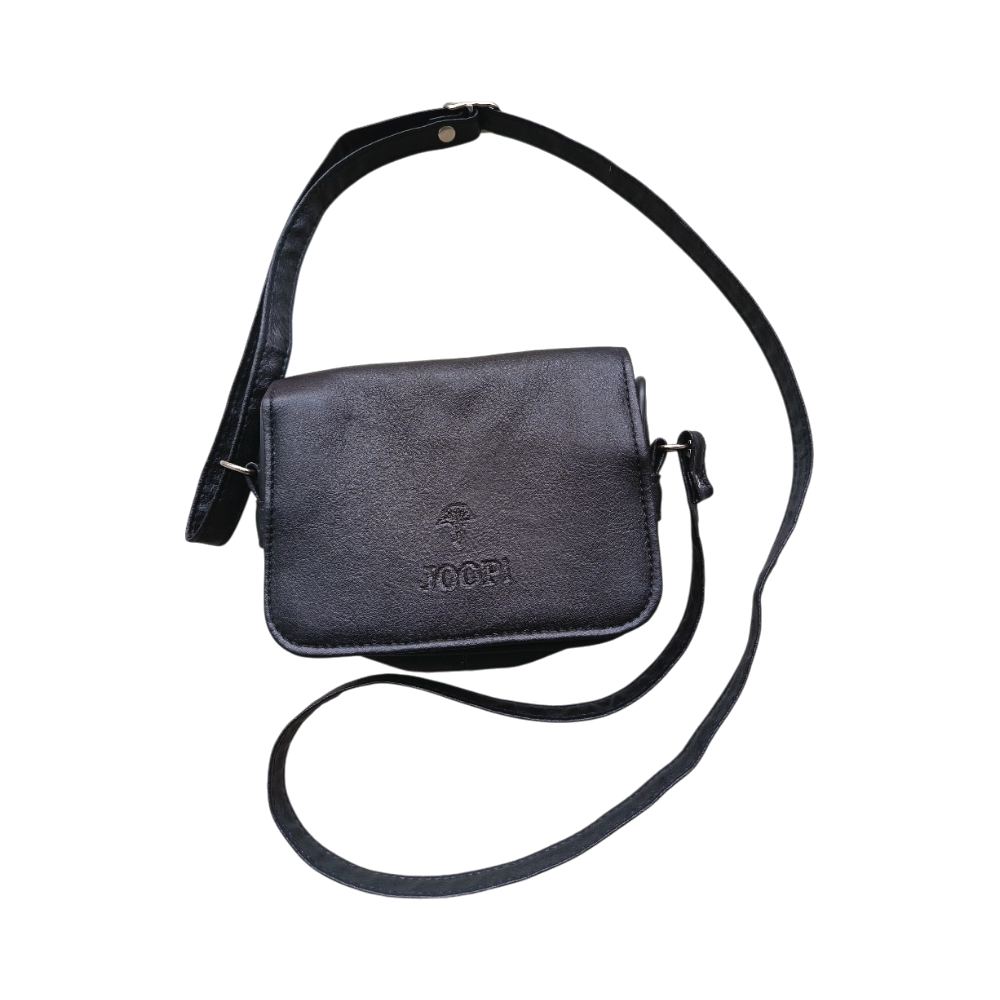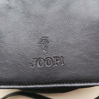 Pieni musta olkalaukku, vetoketjullinen sisätasku.Joop nahkainen materiaali ja koko 15cmx10cm.Säädettävä nahka hihna.