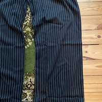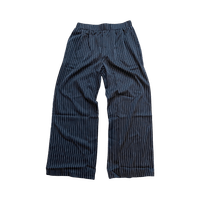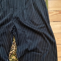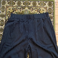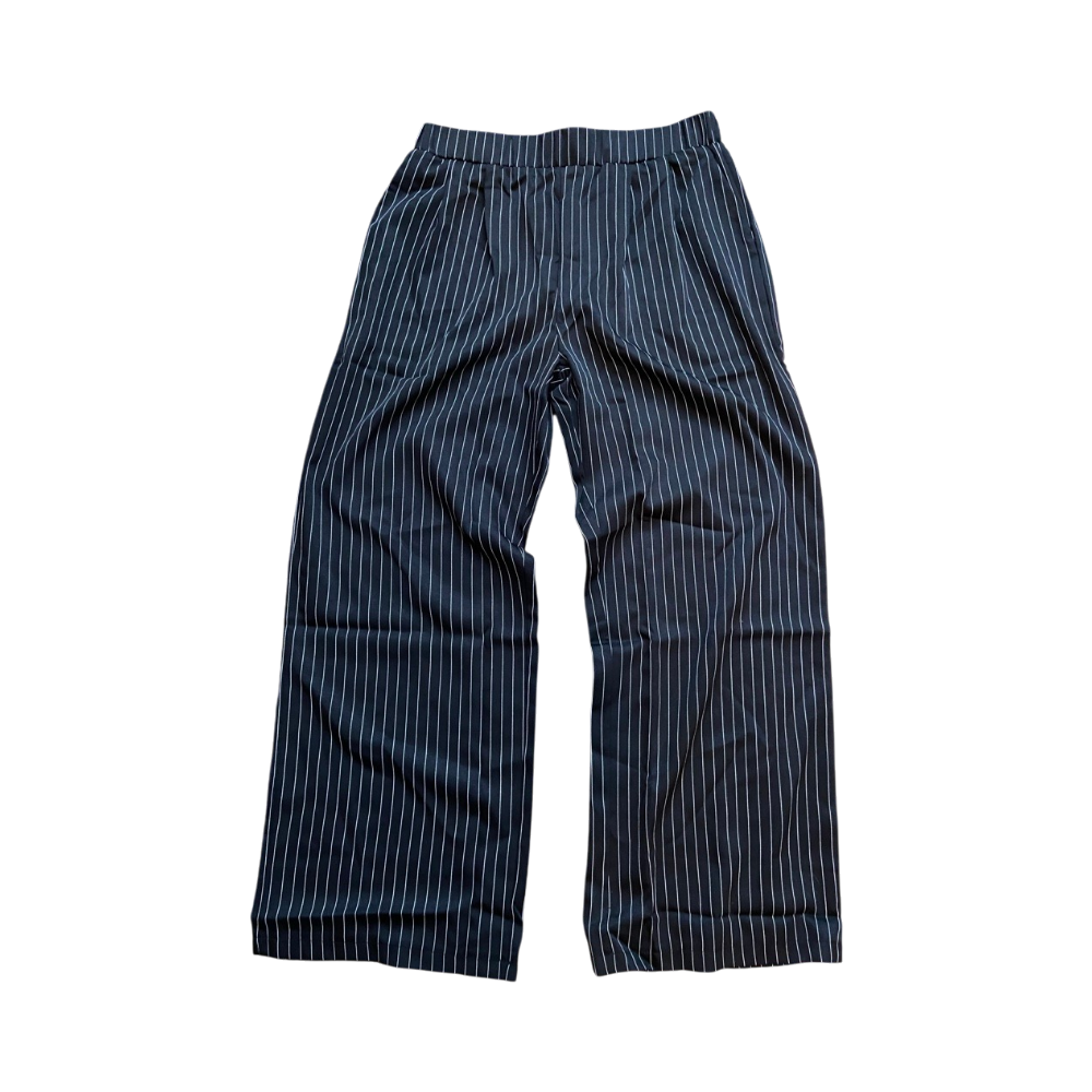 Mustat suorat housut joissa valkoisia raitoja koossa M, lantion leveys 39cm, haara-lahjeväli 72cm ja lahkeen leveys 29cm