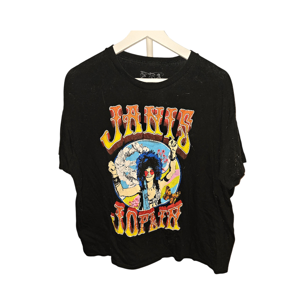 Käytetty musta t-paita, Janis Joplin -kuvitus.